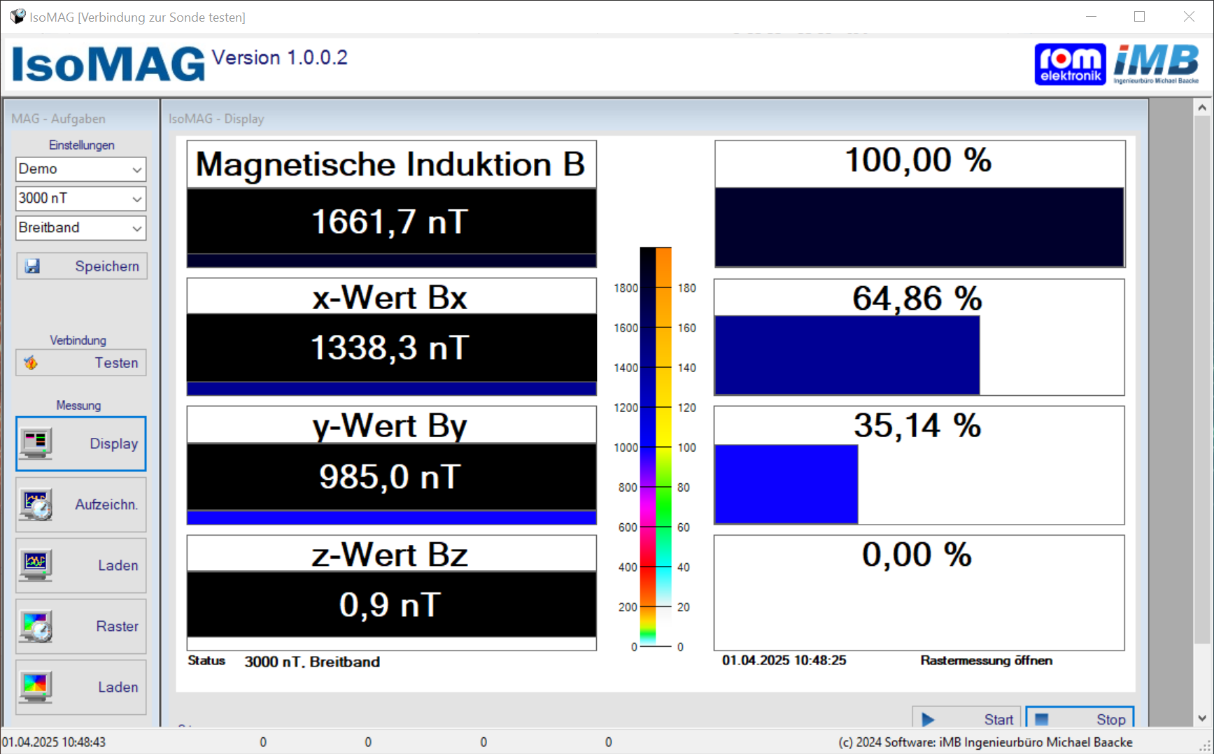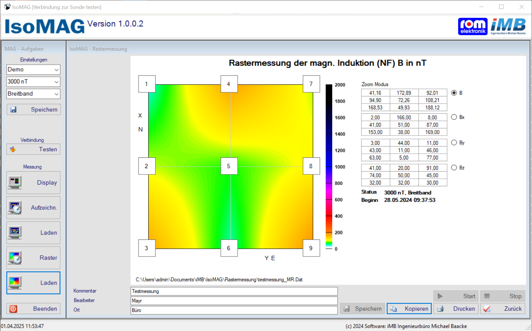 Alle Messgeräte werden bei ROM-Elektronik in Deutschland entwickelt, individuell hergestellt und kalibriert. Dies garantiert höchste Qualitäts-Standards, durch die ROM-Elektronik jedem Kunden volle 24 Monate Garantie für alle Messgeräte bieten kann. Mit der mitgelieferten Software der 3D-IsoMag-Messsonde können mittels der Funktion „Rastermessung“ pro Position mit nur einem Knopfdruck die Daten der Messrichtungen x, y und z gleichzeitig an den Rechner übertragen werden. Daraus generiert die Software eine Grafik, die sehr anschaulich die Feldverteilung im Raum darstellt und damit einen Hinweis auf die Lage der Feldverursacher gibt.