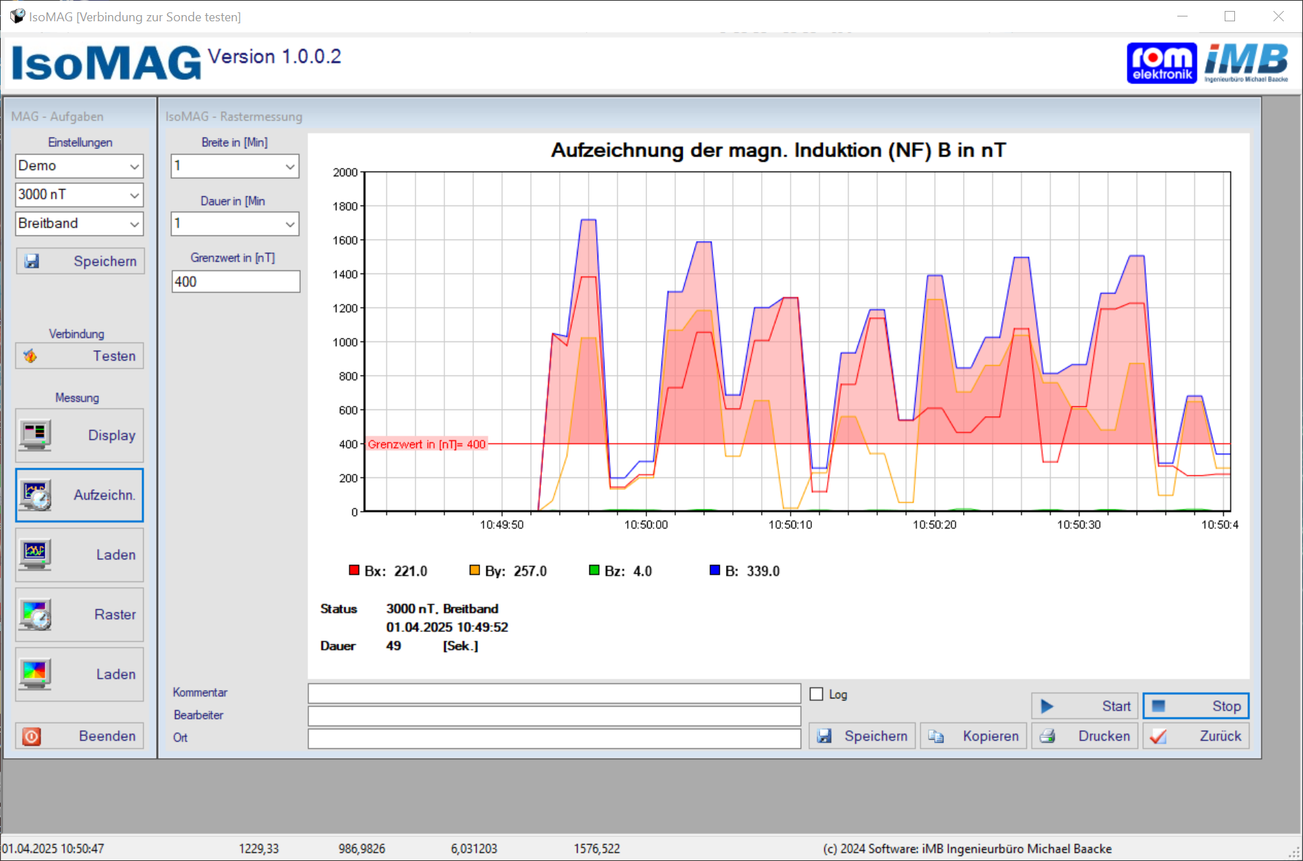 Messung und Langzeitaufzeichnung der niederfrequenten magnetischen Flussdichte (nT) von Netz- und Bahnstrom mittels Windows PC.